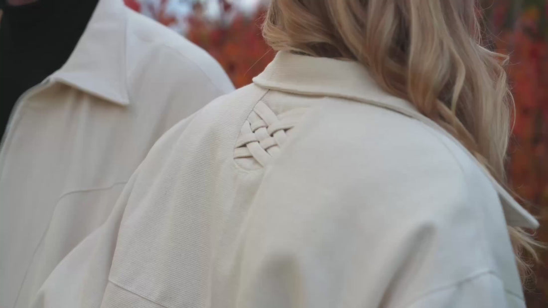 La Veste Signature, pièce oversize en coton blanc cassé, à la coupe ample et structurée.